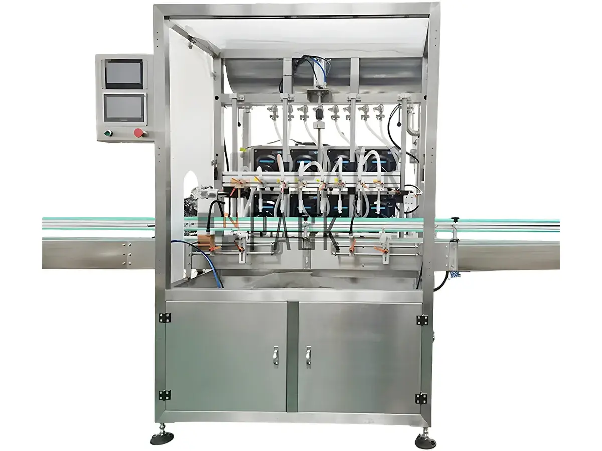 Peristaltic pump liquid filling machine features food-grade hoses to transport liquids, ensuring them are free of contamination and allowing for high-precision filling. Equipped with servo control and touch screen HMI, flexible filling speed adjustment and multi-station synchronous filling is achievable. The anti-splash diving nozzles and photoelectric detection function deliver a more efficient and stable production process. The automatic liquid filling system is installed with stainless steel frame, which is CE and RoHS certified, making it suitable for handling low-viscosity liquids without particulates, ideal for liquid filling applications with high sanitary requirements, including pharmaceutical, cosmetics, food, beverage industries and labs.