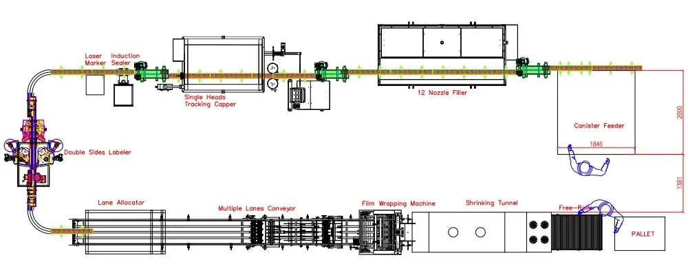 - Solution: Customized an automated line centered around a 12-Head High-Speed Filler, integrated with Tracking Capping, Induction Sealing, Laser Coding, and Double-sided Labeling.